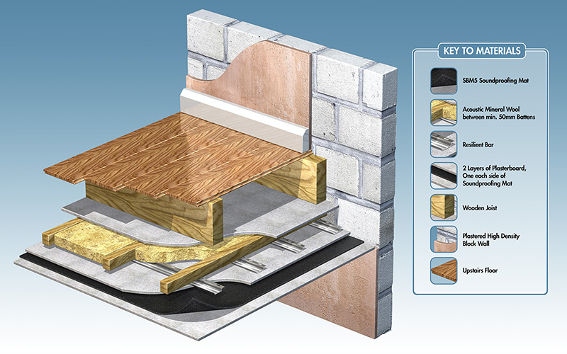 Cut-away ceiling plan alongside (12.5 x 1200 x 2700mm shows a double layer of 12.5mm high density acoustic plasterboard with SBM5 Soundproofing Mat sandwiched between the layers all fixed to Resilient Bars)